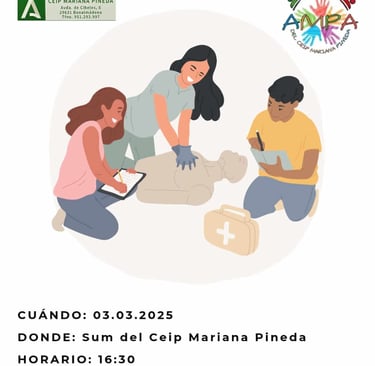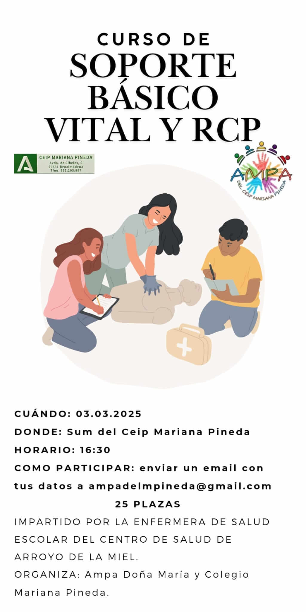 El lunes 3 de marzo a las 16:30, en el SUM del Colegio Mariana Pineda, se impartirá un curso de Soporte Vital dirigido por la enfermera de Zona. Hay 25 plazas disponibles y, si se superan, se organizará otra fecha. Para inscribirte, envía tus datos a ampadelmpineda@gmail.com.