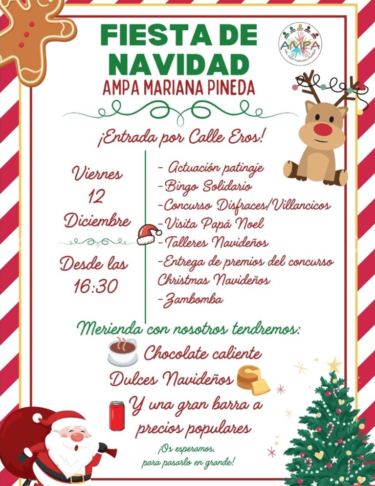 Se acerca una de las tardes más especiales del año… ¡nuestra Fiesta de Navidad🎅🏻🎄! Os esperamos el viernes 12 de diciembre a partir de las 16:30 (entrada por Calle Eros). Hemos preparado un montón de actividades para pasarlo en grande: