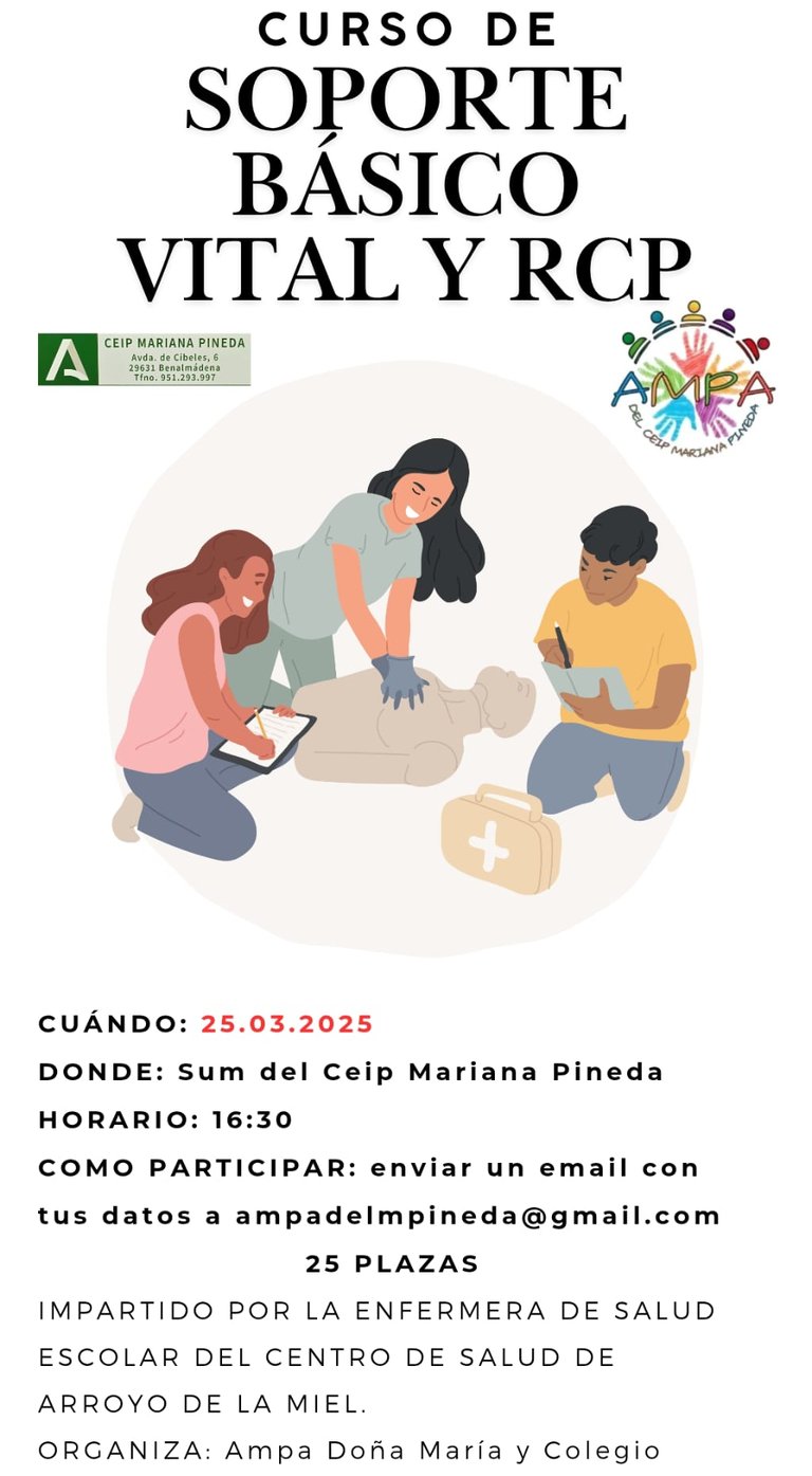 El curso de Soporte Vital, originalmente programado para el 3 de marzo y suspendido por la alerta naranja de la DANA, se realizará el martes 25 de marzo a las 16:30 en el SUM del colegio. Será impartido por la enfermera de zona y cuenta con un máximo de 25 plazas. Para inscribirte, envía un email con tus datos a ampadelmpineda@gmail.com.